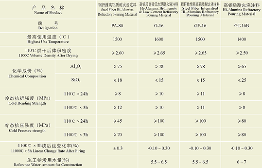 高铝质浇注料PA-80、G-16、GF-16适用于水泥窑前后窑口、篦冷机前端、窑门罩等耐高温部位;GT-16适用于水泥窑炉篦冷机后部和其它工业窑炉衬里。